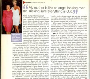 The distance between them hardly keep them apart: “No matter where I travel,” says Ivana, “we spend about nine months together a year. My Mom is very loving and caring. And she’s a strong woman. Her priorities are her grandchildren, (Donald Jr., Ivanka, and Eric) and me. That’s what she lives for.”